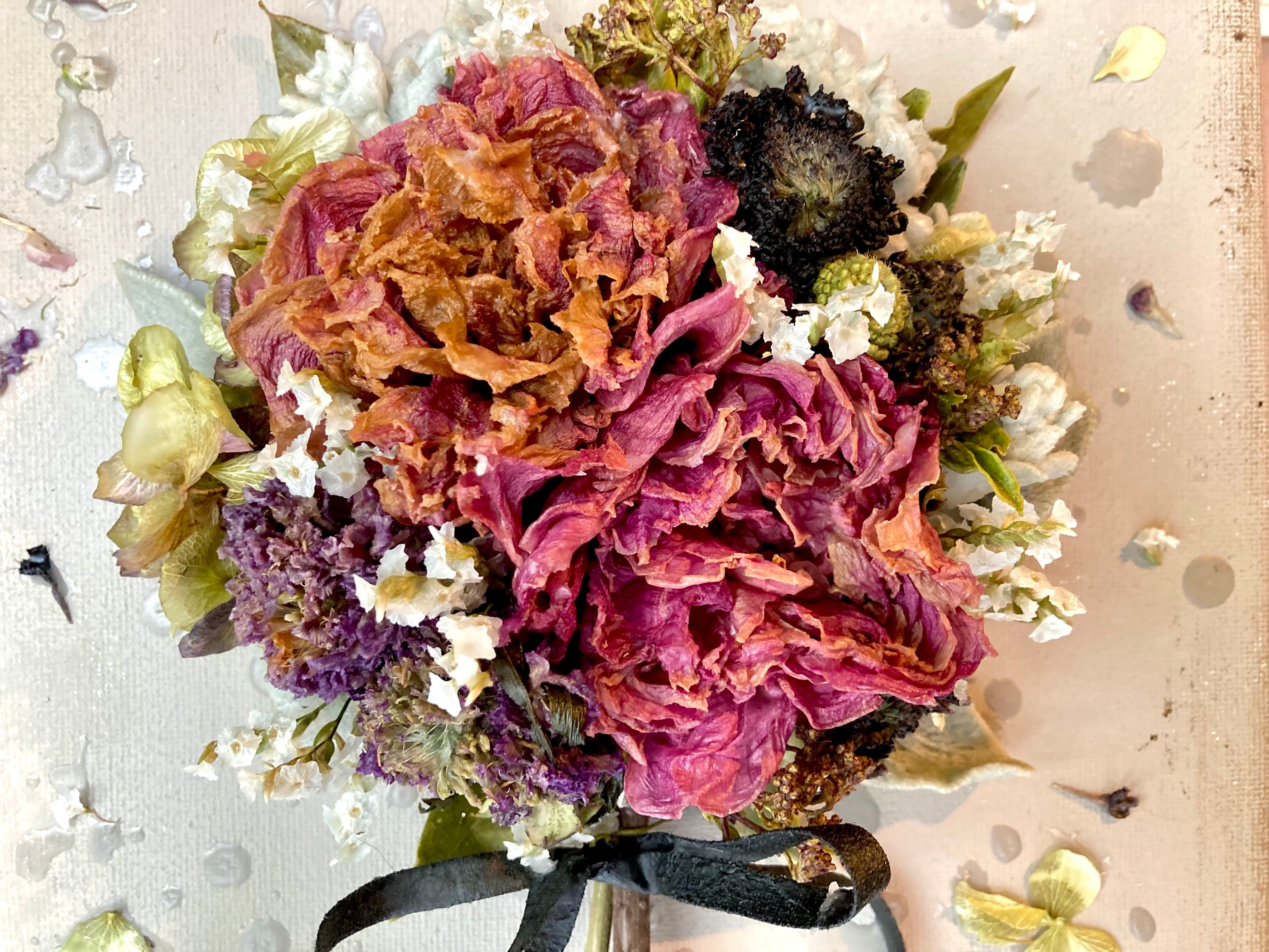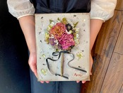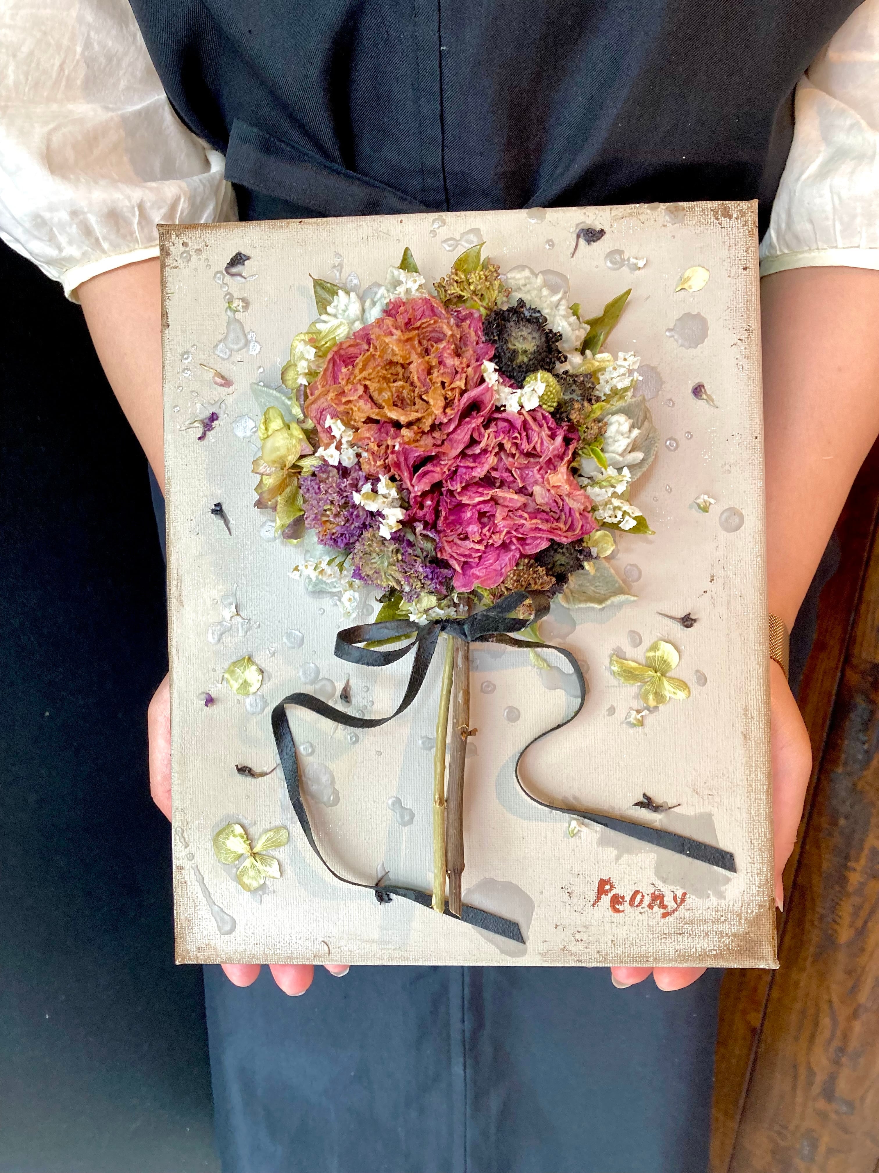 キャンドルコーティングされた花々をキャンバスにアレンジした、