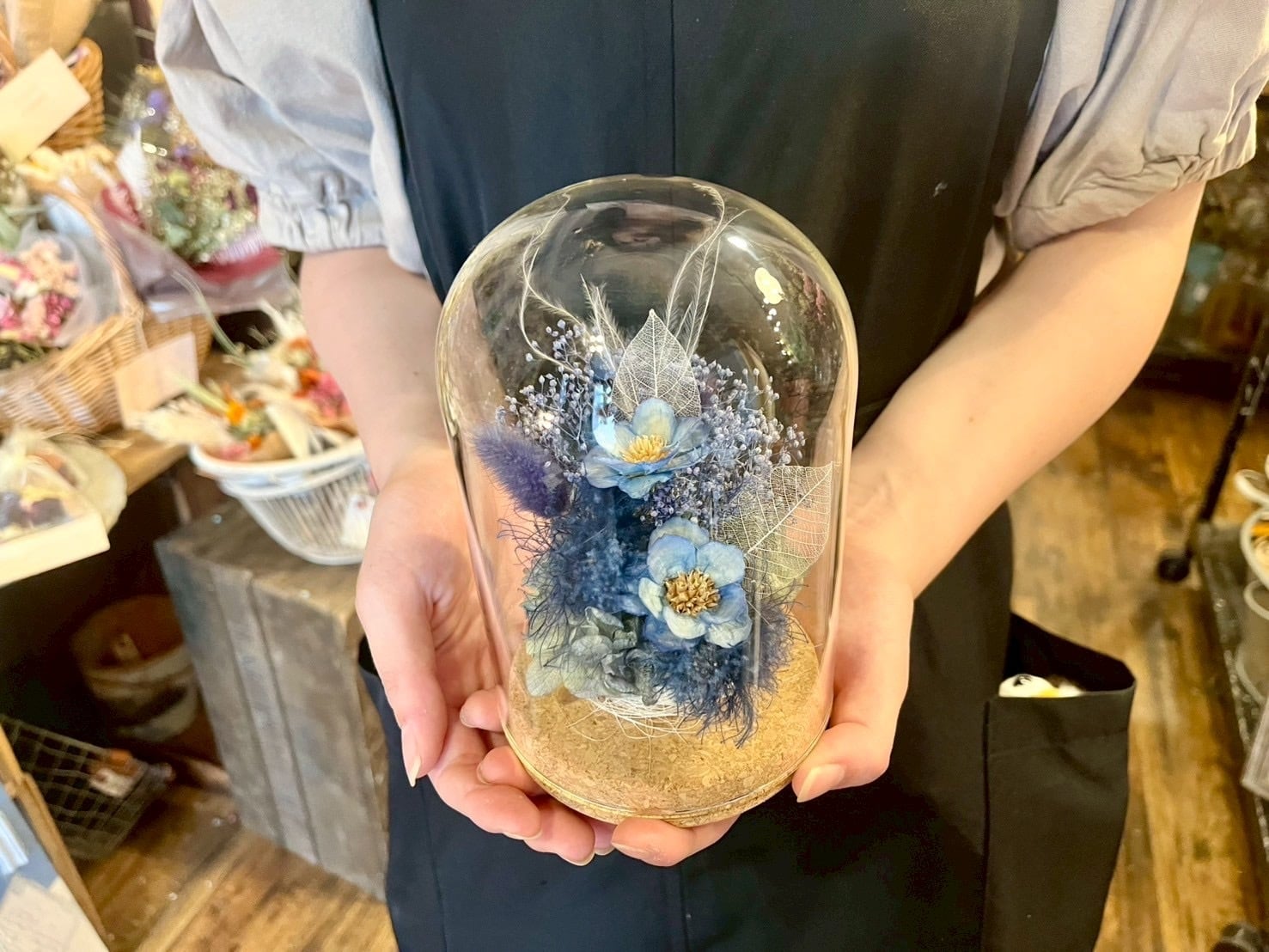 透明感のあるガラスドームの中に、ブルーを基調とした繊細で上品なプリザ―ブドフラワーを閉じ込めました。