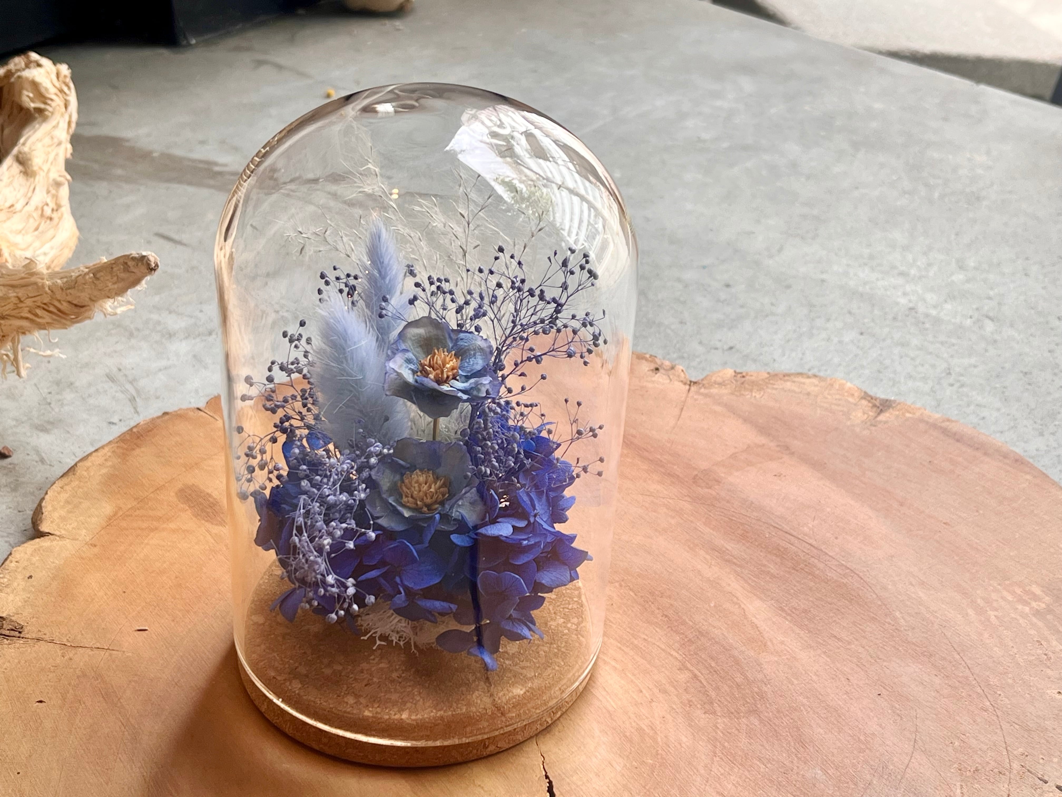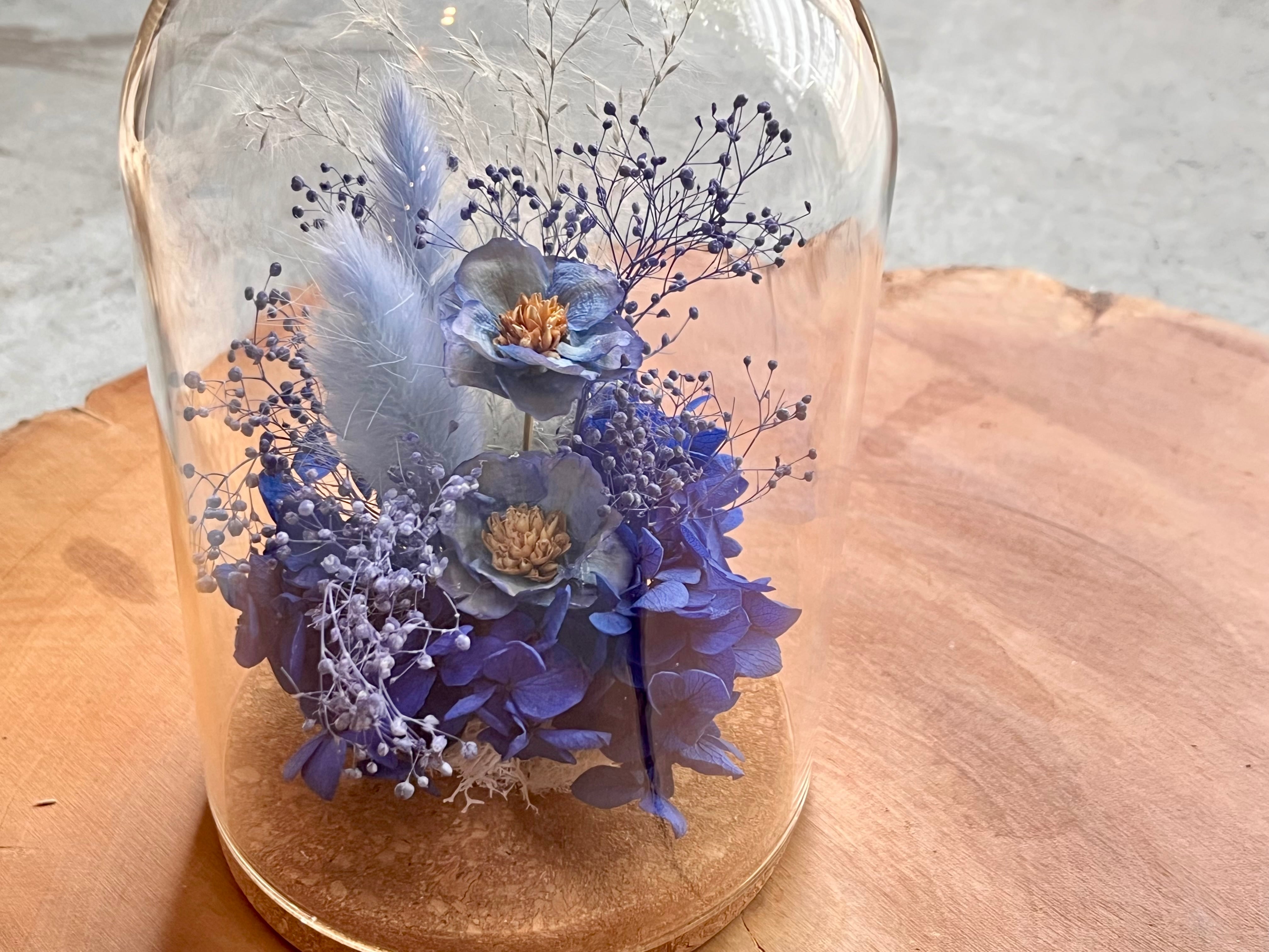 透明感のあるガラスドームの中に、ブルーを基調とした繊細で上品なプリザ―ブドフラワーなどをアレンジしました。