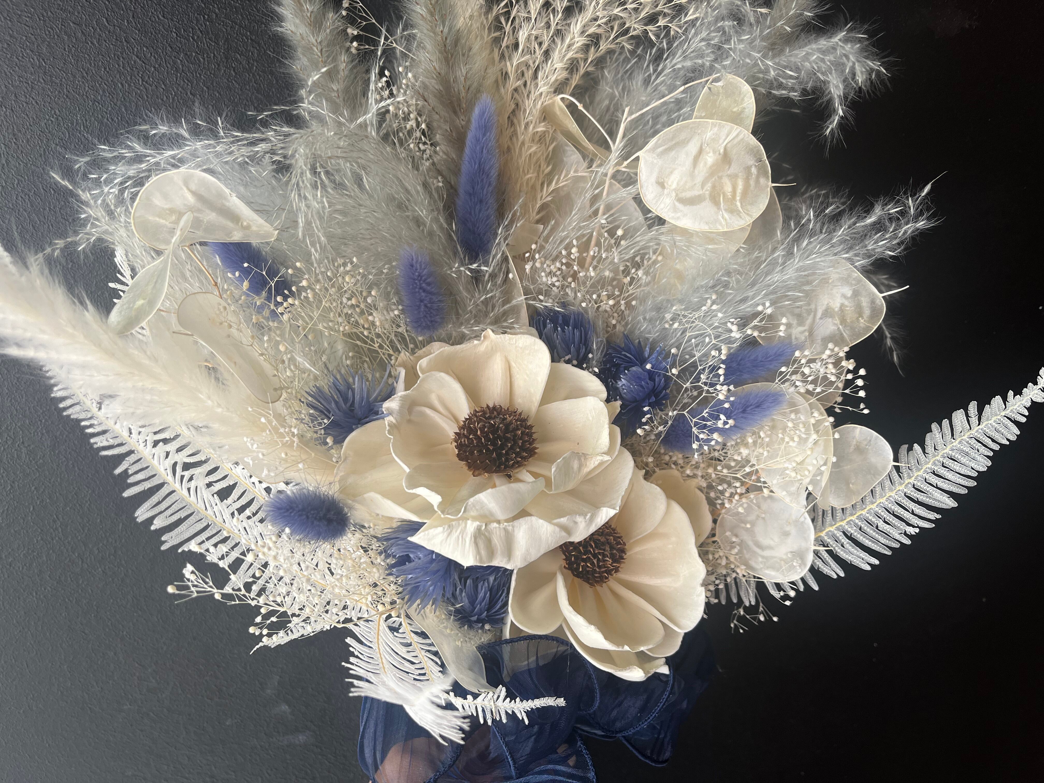 華やかでエレガントなブライダルブーケ【ホワイト&ブルー】ブートニア付きです!